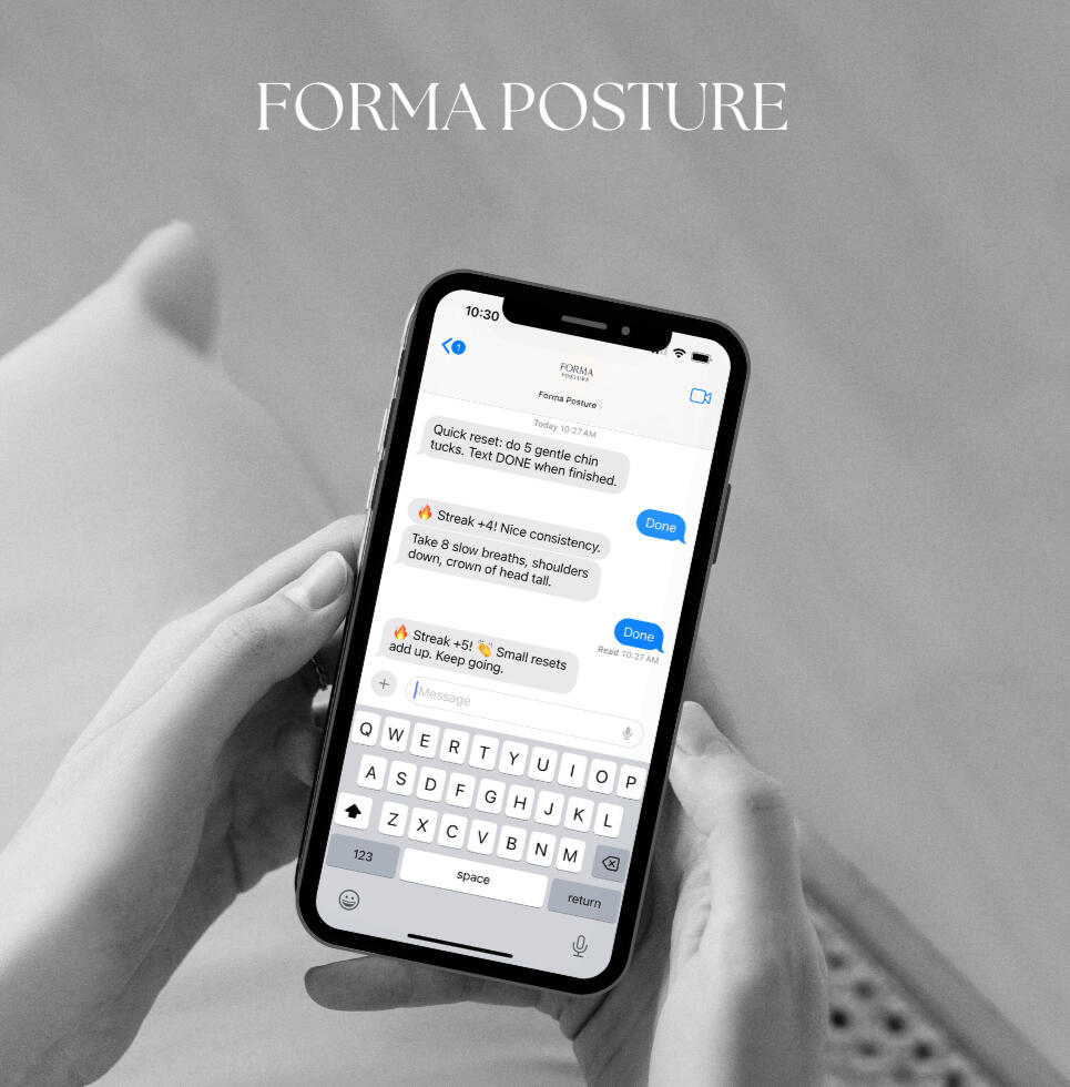 Bring more awareness to how you sit and move throughout the day. The Forma Posture Challenge sends you up to three gentle text messages per day for 30 days. Each message offers a simple posture check or micro-reset you can do in under a minute, plus streak tracking to help you stay consistent.This program is for general wellness and habit support only. It is not a medical service and does not diagnose, treat, or cure any condition. If you have pain or health concerns, please consult a licensed professional.• 60+ posture resets tailored for the modern world
